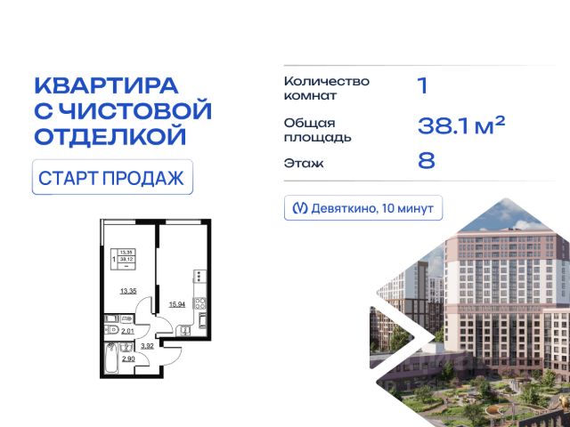Продаётся 1-комн. квартира площадью 37,73 кв.м на 8 этаже 24 этажного дома (Корпус 5, Секция 2) проекта ПИК Заречный парк. Светлый просторный подъезд на уровне земли, функциональная планировка, большие окна, c отделкой. Жилой квартал "Заречный парк" расположен в районе Новое Девяткино Ленинградской области. В 7 минутах на автомобиле - станция метро "Девяткино", до КАД - 10 минут на машине. В 2026 году будет достроена шестиполосная трасса в обход Мурино, примыкающая к Пискарёвскому проспекту. Она станет дополнительным выездом на КАД для жителей "Заречного парка". Проект включает восемь домов высотой от 15 до 24 этажей, три многоуровневых паркинга, детский сад и школу. В зелёных дворах-парках будут оборудованы современные детские и спортивные площадки, обустроены места для отдыха. На первых этажах разместятся магазины, кафе и другие сервисы. Планировки продуманы так, чтобы каждый квадратный метр жилой площади можно было эффективно использовать. Все квартиры сдаются с готовой отделкой. Артикул 1021850 (Застройщик ООО "СПЕЦИАЛИЗИРОВАННЫЙ ЗАСТРОЙЩИК ИНВЕСТАЛЬЯНС") [cn_sbp_1828918]