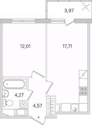 -приведенная площадь квартиры 39.54 кв.м., общая -36.5 кв.м., кухня-гостиная 14.86; спальная комната 13.36 кв.м., лоджия 3.14 кв.м., совмещенный санузел 3.50 кв.м., прихожая 4.68 кв.м.;