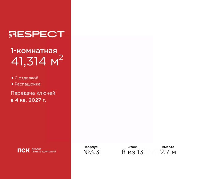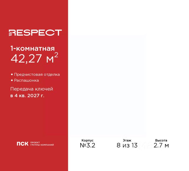 Однокомнатная квартира с предчистовой отделкой в ЖК "RESPECT" на 8 этаже. Общая площадь: 42.705 кв.м., жилая: 15.9 кв.м., площадь просторной кухни-столовой: 12.02 кв.м. Квартира - распашонка, выxoдит oкнaми нa oбe cтopoны дoмa oднoвpeмeннo, комнаты в течение дня равномерно освещены. В квартире один балкон, один совмещенный санузел. Высота потолков 2.7 м. Квартира будет сдана с отделкой WHITE BOX, в которую включены следующие виды работ: - заливка стяжки; - установлена система отопления квартиры; - подготовлены потолки; - все стены выровнены, загрунтованы и отштукатурены; - электрическая проводка разведена по комнатам. Квартира будет готова к чистовой отделке. Дом монолитный, многоподъездный, переменной этажности, от 10 до 13 этажей. Квартира находится в 1-й секции высотой 13 этажей в корпусе 3.2. На этаже 5 квартир. В подъезде 1 пассажирский и 1 грузовой лифт. Начало строительства - 3 квартал 2025 года. Окончание строительства - 4 квартал 2027 года. Оформление сделки по договору долевого участия. В шаговой доступности от жилого комплекса имеются станции метро (расстояние по прямой): "Лесная" (800 м), "Площадь Мужества" (1.4 км), "Выборгская" (1.9 км), также недалеко от этого корпуса расположены станции метро: "Академическая", "Политехническая". Квартал строится на Полюстровском пр, 87, в одной из самых востребованных локаций Петербурга. В 10 минутах пешком - метро "Лесная" и в 10 минутах на транспорте - Петроградская сторона. Высота домов от 7 до 13 этажей. На территории Respect строится школа на 1125 учащихся и детский сад на 240 мест. Запроектированы собственная газовая котельная, закрытая территория, дворы без машин и подземные паркинги с лифтами. Вентилируемые фасады облицованы клинкерным кирпичом. Дома из этого материала служат веками, являясь гордостью хозяев. Дизайн парадных зон и входных групп - сочетание лаконичности отделки и декоративных элементов с текстурами из натурального камня и дерева с приглушенной подсветкой теплым светом. Во входных группах расположены гостевые зоны с мягкой мебелью. Вся территория квартала будет связана единой концепцией благоустройства, разработанной ландшафтным бюро L.BURO. В основе - идея создания увлекательного ландшафтного пространства для насыщенной жизни, включающего в себя пейзажные зоны, современные архитектурные композиции, открытые террасы на стилобатах с зонами отдыха и парклетами, спортивными площадками. Это пространство для людей всех возрастов и различных увлечений. На эксплуатируемой кровле на уровне первого этажа в домах 1 и 4 будут обустроены общественные видовые террасы. В квартале запроектированы внутренние закрытые территории дворов домов без доступа автомобилей и безбарьерная среда для велосипедистов и колясок. Предусмотрены IP-домофония с функцией дистанционного открывания калиток и парадных, а также дистанционный сбор показаний счетчиков и мобильное приложение для жителей. Для безопасности жителей квартала - круглосуточное видеонаблюдение и служба охраны. В к