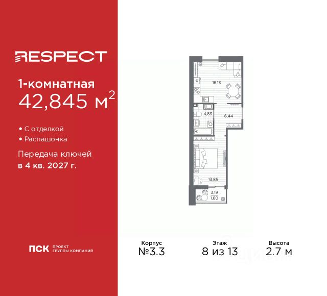Однокомнатная квартира с предчистовой отделкой в ЖК "RESPECT" на 8 этаже. Общая площадь: 41.35 кв.м., жилая: 13.2 кв.м., площадь просторной кухни-столовой: 14.49 кв.м. Все окна выходят на одну сторону. В квартире одна лоджия, один совмещенный санузел. Высота потолков 2.7 м. Дом монолитный, многоподъездный, переменной этажности, от 10 до 13 этажей. Квартира находится в 1-й секции высотой 13 этажей в корпусе 3.2. На этаже 5 квартир. В подъезде 1 пассажирский и 1 грузовой лифт. Начало строительства - 3 квартал 2025 года. Окончание строительства - 4 квартал 2027 года. Оформление сделки по договору долевого участия. В шаговой доступности от жилого комплекса имеются станции метро (расстояние по прямой): "Лесная" (800 м), "Площадь Мужества" (1.4 км), "Выборгская" (1.9 км), также недалеко от этого корпуса расположены станции метро: "Академическая", "Политехническая". Жилой квартал "RESPECT" строится на Полюстровском пр, 87, в одной из самых востребованных локаций Петербурга. В 10 минутах пешком - метро "Лесная" и в 10 минутах на транспорте - Петроградская сторона. Высота домов от 7 до 13 этажей. Квартиры сдаются с отделкой white box и с чистовой отделкой. На территории Respect строится школа на 1125 учащихся и детский сад на 240 мест. Запроектированы собственная газовая котельная, закрытая территория, дворы без машин и подземные паркинги с лифтами. В проекте предусмотрены трапециевидные балконы или остекленные лоджии, которые, с одной стороны, исключают монотонность фасада, являясь декоративными элементами, с другой дополнительным функциональным пространством в квартирах. Цветовая гармония фасадов каждого дома раскрывает характер квартала. Коричневый цвет клинкерного кирпича со структурой водяных штрихов — цвет уюта и безопасности, сдержанности и надёжности. Вентилируемые фасады облицованы клинкерным кирпичом. Его высокая прочность позволяет давать 100 лет гарантии на этот материал. Водопоглощение клинкерного кирпича составляет менее 5%, за счет чего у него высокая теплопроводность и прочность. В квартале запроектированы внутренние закрытые территории дворов домов без доступа автомобилей и безбарьерная среда для велосипедистов и колясок. Предусмотрены IP-домофония с функцией дистанционного открывания калиток и парадных, а также дистанционный сбор показаний счетчиков и мобильное приложение для жителей. Для безопасности жителей квартала - круглосуточное видеонаблюдение и служба охраны. В каждой квартире предусмотрены внешние корзины для кондиционеров. Вся территория квартала будет связана единой концепцией благоустройства, разработанной ландшафтным бюро L.BURO. На эксплуатируемой кровле на уровне первого этажа в домах 1 и 4 будут обустроены общественные видовые террасы. Это станет не только привлекательным местом с красивым видом, но и удобным, многофункциональным пространством. Дизайн парадных зон и входных групп - сочетание лаконичности отделки и декоративных элементов с текстурами из натурального камня и дерева с приглушенной под