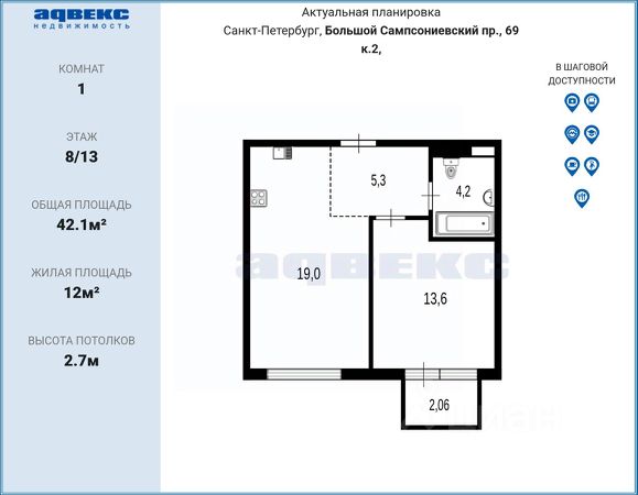 Квартира с одной спальней в комплексе "Сампсониевский 32" от LEGENDA на 8 этаже. -Общая площадь: 45.78 кв.м. -Жилая: 12.17 кв.м. -Площадь просторной кухни-столовой: 20.49 кв.м. -Высота потолков 2.7 м. Все окна выходят на одну сторону. В квартире один балкон, один раздельный санузел. ЖК "Сампсониевский, 32" квартал бизнес-класса в Выборгском районе Санкт-Петербурга недалеко от набережной Большой Невки и Петроградской стороны. Отличают комплекс каскадные фасады с большой площадью остекления, видовые квартиры с террасами. Современные инженерные и технические решения, повышающие качество жизни TechnoBox включают в себя: стационарный и удаленный контроль дома, систему Air Design, обеспечивающую чистый воздух без лишнего шума, мультисервисную сеть, объединяющую коммуникационные системы. Квартиры сдаются с предчистовой отделкой: выровнены пол и стены, проведена электрика, предусмотрена шумоизоляция, встроенная система вентиляции. В каждой квартире установлена взломостойкая входная дверь, окна со специальным термоизолированным алюминиевым профилем. В ЖК "Сампсониевский, 32" много вариантов планировок: квартиры с террасой, мастер-спальней, ванной комнатой с окном, гардеробной комнатой. Двор закрыт от транспорта, здесь будут зоны с дизайнерским оформлением для игр и отдыха. Срок сдачи 4 квартал 2026 года. В отапливаемом подземном паркинге 298 мест, спуститься туда можно на лифте из своей квартиры. Комплекс находится на границе крупных районов, рядом с набережными, которые ведут в Приморский, Калининский и Центральный районы, а через Сампсониевский, Гренадёрский и Кантемировский мосты можно попасть в Петроградский район. До станции метро "Выборгская" 900 м, до станции метро "Петроградская" 2,6 км. Финляндский вокзал находится в 2,5 км от ЖК, а Западный скоростной диаметр (ЗСД) в 10 км. Рядом с ЖК находится несколько гимназий, общеобразовательных школ и детских садов. Здесь много медицинских учреждений, кафе, ресторанов, торговых центров, гипермаркетов. Меньше чем в 1 км от ЖК Сампсониевский и Выборгский сады, а в 2 км находится Ботанический сад, набережная реки Карповки с качелями и зонами отдыха у воды.