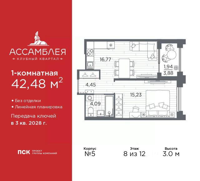Продается 1-комн. квартира в Клубный квартал "Ассамблея" на 8 этаже. Квартира без отделки, после выдачи ключей можно делать ремонт. Общая площадь: 38.82 кв.м., жилая: 10.17 кв.м., площадь просторной кухни-столовой: 17.13 кв.м. Все окна выходят на одну сторону. В квартире одна лоджия, один совмещенный санузел. Высота потолков 3.0 м. Дом монолитный, черырехподъездный, высотой 12 этажей. Квартира находится в 4-й секции в корпусе 5. На этаже 10 квартир. В подъезде 1 пассажирский и 1 грузовой лифт. Окончание строительства - 3 квартал 2028 года. Оформление сделки по договору долевого участия. В шаговой доступности от жилого комплекса расположены станции метро (расстояние по прямой): "Горный институт" (1.0 км), "Василеостровская" (1.4 км), "Приморская" (1.5 км), также недалеко от этого корпуса находятся станции метро: "Спортивная", "Чкаловская". "Клубный квартал Ассамблея" — проект бизнес-класса на Васильевском острове, в самом сердце исторического Петербурга. Комплекс состоит из пяти корпусов переменной этажности — от 7 до 12 этажей — с выразительной архитектурой в стиле неомодернизма: светлый клинкер, панорамное остекление, просторное лобби с потолками высотой почти 8 метров. Потолки — до 3,2 метров. Подземный паркинг на 667 машиномест. Комфорт и инфраструктура Проект ориентирован на комфортную городскую жизнь. В закрытом дворе — ландшафтное озеленение, современные детские и спортивные площадки. Внутренний клуб для резидентов включает коворкинг, переговорные, кинозал, фитнес и бьюти-зону. IP-домофония с просмотром камер видеонаблюдения, дистанционное открывание дверей и доступа на территорию и в парадную со смартфона и планшета, просмотр показаний счетчиков, приложение для жителей PSK Home. Локация Расположение на Васильевском острове — сильная сторона проекта. До четырех станций метро ("Горный институт", "Василеостровская", "Спортивная", "Приморская") — 515 минут пешком. В шаговой доступности — зелёные зоны, культурные учреждения, в том числе сад "Василеостровец" и ДК имени Кирова. Основные магистрали Большой, Средний и Малый проспекты, Наличная и Уральская улицы. Съезд на ЗСД расположен недалеко от станции метро "Приморская", близ береговой линии. Благовещенский и Дворцовый мосты соединяют остров с центром города, а мосты Тучков, Биржевой и Бетанкура — с Петроградской стороной. Застройщик Группа компаний ПСК является одной из ведущих девелоперских компаний Санкт Петербурга. На протяжении 18 лет она возводит в Северной столице качественное жилье премиум, бизнес и комфорт-класса, социальные объекты школы и детские сады, апарт-отели и торговые центры. Является шестикратным обладателем золотого знака "Надежный застройщик России". #zMB9F2