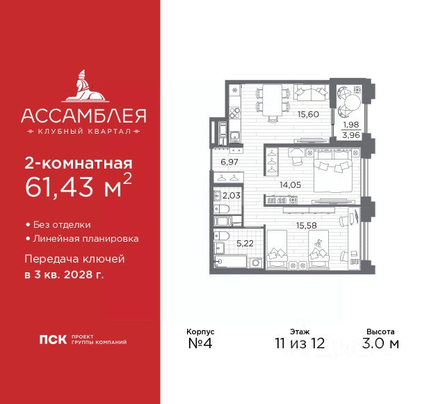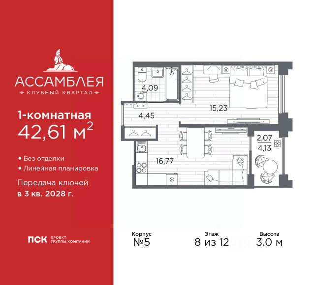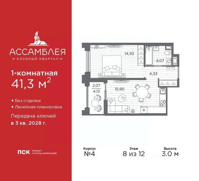 Однокомнатная квартира от застройщика в Клубный квартал "Ассамблея" на 8 этаже. Квартира без отделки, после оформления собственности можно делать ремонт. Общая площадь: 31.33 кв.м., жилая: 11.29 кв.м., площадь просторной кухни-столовой: 10.17 кв.м. Все окна выходят на одну сторону. В квартире один совмещенный санузел. Высота потолков 3.0 м. Дом монолитный, черырехподъездный, высотой 12 этажей. Квартира находится во 2-й секции в корпусе 5. На этаже 8 квартир. В подъезде 1 пассажирский и 1 грузовой лифт. Окончание строительства - 3 квартал 2028 года. Оформление сделки по договору долевого участия. В шаговой доступности от жилого комплекса имеются станции метро (расстояние по прямой): "Горный институт" (1.0 км), "Василеостровская" (1.4 км), "Приморская" (1.5 км), также недалеко от этого корпуса расположены станции метро: "Спортивная", "Чкаловская". "Клубный квартал Ассамблея" — проект бизнес-класса на Васильевском острове, в самом сердце исторического Петербурга. Комплекс состоит из пяти корпусов переменной этажности — от 7 до 12 этажей — с выразительной архитектурой в стиле неомодернизма: светлый клинкер, панорамное остекление, просторное лобби с потолками высотой почти 8 метров. Потолки — до 3,2 метров. Подземный паркинг на 667 машиномест. Комфорт и инфраструктура Проект ориентирован на комфортную городскую жизнь. В закрытом дворе — ландшафтное озеленение, современные детские и спортивные площадки. Внутренний клуб для резидентов включает коворкинг, переговорные, кинозал, фитнес и бьюти-зону. IP-домофония с просмотром камер видеонаблюдения, дистанционное открывание дверей и доступа на территорию и в парадную со смартфона и планшета, просмотр показаний счетчиков, приложение для жителей PSK Home. Локация Расположение на Васильевском острове — сильная сторона проекта. До четырех станций метро ("Горный институт", "Василеостровская", "Спортивная", "Приморская") — 515 минут пешком. В шаговой доступности — зелёные зоны, культурные учреждения, в том числе сад "Василеостровец" и ДК имени Кирова. Основные магистрали Большой, Средний и Малый проспекты, Наличная и Уральская улицы. Съезд на ЗСД расположен недалеко от станции метро "Приморская", близ береговой линии. Благовещенский и Дворцовый мосты соединяют остров с центром города, а мосты Тучков, Биржевой и Бетанкура — с Петроградской стороной. Застройщик Группа компаний ПСК является одной из ведущих девелоперских компаний Санкт Петербурга. На протяжении 18 лет она возводит в Северной столице качественное жилье премиум, бизнес и комфорт-класса, социальные объекты школы и детские сады, апарт-отели и торговые центры. Является шестикратным обладателем золотого знака "Надежный застройщик России". #2MbgaS