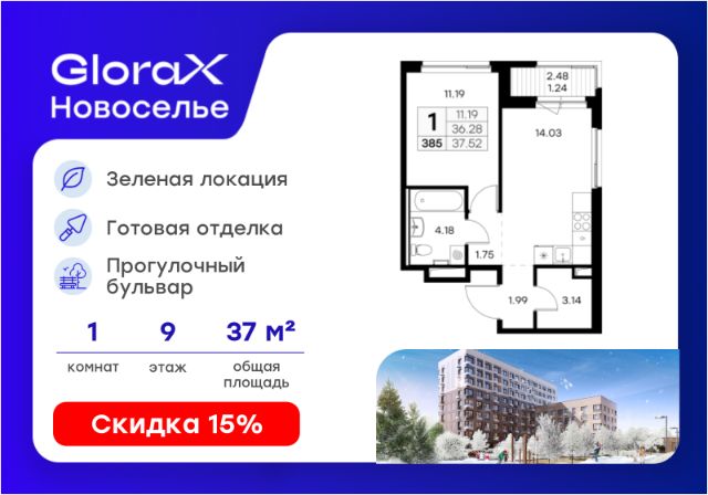 Продается 1-комн. квартира на 9-м этаже в строящемся проекте комфорт-класса GloraX Новоселье. Общая площадь лота составляет 31,62 кв. м, из которых 10,45 кв. м отведено под жилую и 11,87 кв. м под кухонную зону. Номер квартиры - 123 Преимущества квартиры: - Квартиры комфорт-класса с чистовой отделкой в двух цветовых гаммах на выбор - Зеленый район, 5 мин. до Гореловсого лесопарки, 10 мин. до Шунгеровского заказника - 7 мин. до КАД, 16 мин. до ЗСД - 864 м/м на открытой стоянке - Благоустроенный собственный прогулочный бульвар - Закрытые дворы с видеонаблюдением - Детские площадки с геопласткой и бизиборадми - Сад и школа в шаговой доступности - Спортивные площадки и вело-дорожки - Коммерческие помещения на 1 этажах GloraX Новоселье — новый проект комфорт-класса на юго-западной границе Санкт-Петербурга и Ленинградской области. Близость к зеленым зонам Гореловского лесопарка и природного Шунгеровского заказника, а также пешеходный многофункциональный бульвар в центре квартала — идеальное место для тех, кто ценит природу и тишину, при этом не готов отказываться от благ современной инфраструктуры. Застройка осуществляется в рамках единой концепции, предусматривающей не только создание комфортного жилья, но и формирование собственной внутренней благоустроенной среды. Территория каждого двора разделена на зоны отдыха, досуга и игровые площадки с учетом возраста и потребностей детей и взрослых создает неповторимую атмосферу, заряжающую энергией на новые свершения. Это проект, в котором спокойно во всех отношениях. Живите на природе, но с комфортом мегаполиса. Проведите теплые дни в Гореловском лесопарке. Познакомьте детей с историей в Стрельне, Петергофе или Красном селе. Они разположены в 30 минутах от проекта. До ж/д станции "Сергиево" 11 минут на автомобиле, до метро Проспект Ветеранов 20 минут, КАД 7 минут, ЗСД 16 минут. В шаговой доступности остановка общественного транспорта. Рядом с проектом будут построены школа и детский сад. Здесь все создано для максимального комфорта каждого жителя. Приватное пространство внутреннего двора с беседками для работы и отдыха, зеленый двор с уютным многоуровневым освещением, детскими эко-площадками и спортивными workout создает неповторимую атмосферу, заряжающую энергией на новые свершения. Цена указана при 100% оплате или стандартной ипотеке. Узнайте подробности в Отделе продаж.
