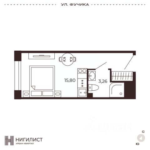 Площадь квартиры 28.8 кв.м., 6 этаж.
