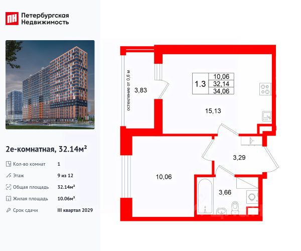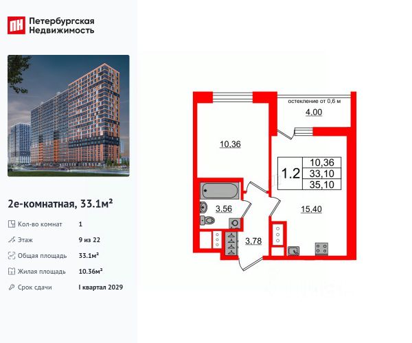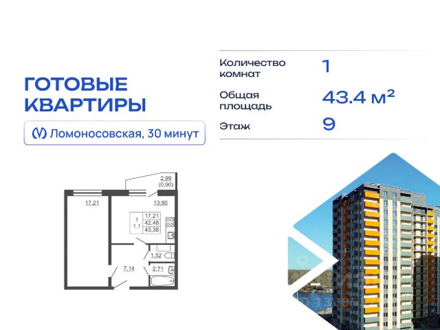 Строим кварталы для жизни с заботой о будущем. Предлагается 1-комнатная квартира комфорт-класса площадью 33,1 кв.м в корпусе 39 на 9-м этаже, в жилом комплексе "Новое Колпино".