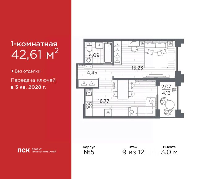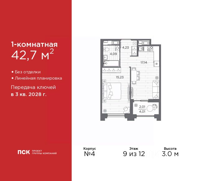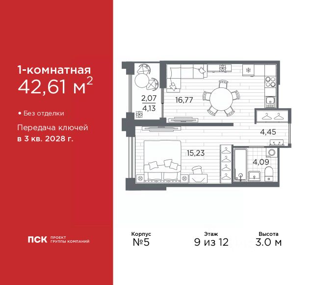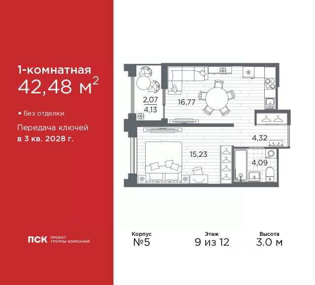 Дом монолитный, черырехподъездный, высотой 12 этажей. Квартира находится в 4-й секции в корпусе 5. На этаже 10 квартир. В подъезде 1 пассажирский и 1 грузовой лифт. Окончание строительства - 3 квартал 2028 года. Оформление сделки по договору долевого участия.