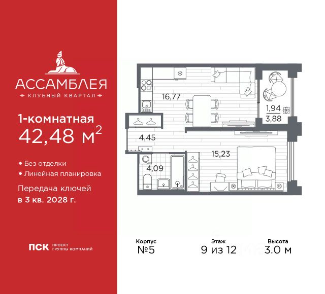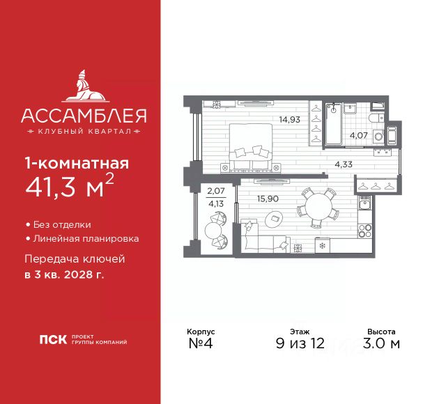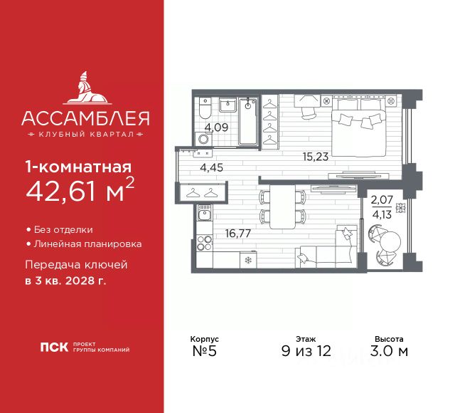 1-комн. квартира от застройщика в Клубный квартал "Ассамблея" на 9 этаже. Квартира без отделки, полностью готова к ремонту. Общая площадь: 46.54 кв.м., жилая: 13.85 кв.м., площадь просторной кухни-столовой: 21.16 кв.м. Все окна выходят на одну сторону. В квартире одна лоджия, один совмещенный санузел. Высота потолков 3.0 м.