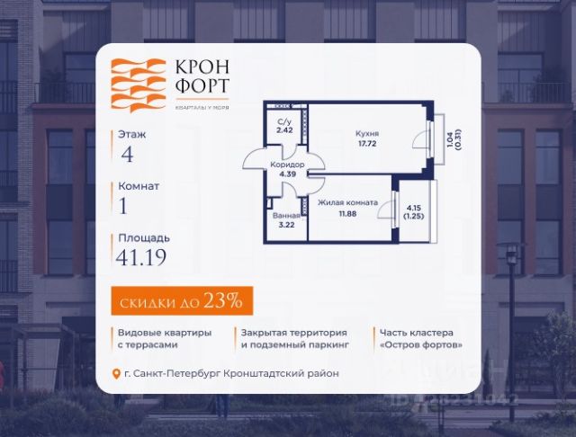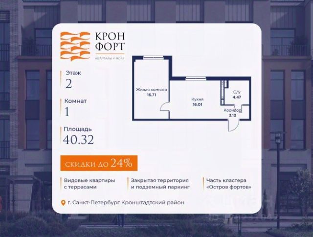 Повышение цен с 10.04! Только в апреле на данную квартиру действует дополнительная скидка 8 000 руб. с кв.м. Стоимость квартиры в объявлении указана со скидкой 21%. Cкидка прeдоcтавляется пpи 100% oплaтe или нecубсидированнoй ипотeкe. Возможно повышение скидки до 24%. Подробности уточняйте в отделе продаж. Предлaгaeтся квартира плoщaдью 52.3 кв.м в жилом кoмплексе "Kронфoрт. Центpальный" в Санкт-Петeрбурге (Кронштадт). Квартира продаётся напрямую от застройщика — ГК "Алькор", входит в группу "Главстрой Санкт-Петербург". Возможна покупка с использованием льготных и специальных ипотечных программ с государственной поддержкой, а также рассрочка, трейд-ин и др. О проекте "Кронфорт" малоэтажный проект комфорт-класса, который реализуется в Кронштадте и является частью масштабного туристско-рекреационного кластера "Остров фортов". Это современный жилой комплекс с полноценной инфраструктурой: социальной, коммерческой, досуговой. Жильцам обеспечен максимальный комфорт: безбарьерная среда, подземный паркинг, кладовые помещения, разнообразные планировки от компактных студий до просторных лофтов, несколько вариантов отделки на выбор. Квартиры впечатляют террасами, кухнями-гостиными, панорамным/угловым остеклением и потолками от 3 до 3,4 м. Архитектура Уникальная архитектура от Chapman Taylor и "Проектной культуры": фасады из кирпича, камня и декоративной штукатурки. Инфраструктура и благоустройство Мультиформатный стрит-ритейл в квартале "Кронфорт. Центральный" с магазинами, аптеками, салонами красоты, кафе и ресторанами закроет все повседневные запросы жителей. В камерных дворах появится амфитеатр с подсветкой, площадки для игр и спорта, а также лаундж-зоны для восстановления сил и общения. Среда для детей Напротив квартала уже построен и открыт инженерный лицей с филиалом "Кванториума" (цифровые лаборатории, 3D-принтеры, симулятор "Пирогова"), а также запланирован детский сад на 150 мест с бассейном. Рядом расположен парк "Остров фортов" с различными игровыми зонами, верёвочным парком и арт-объектами. Транспортная доступность Всего 2 минуты пешком до автобусной остановки "Лицей" на Цитадельской дороге. На авто — 10 минут до КАД, 25 минут до Сестрорецка, 30 минут до "Лахта центра", 50 минут до "Пулково" и 60 минут до "Московского вокзала", а на скоростных катамаранах до "Эрмитажа" — 60 минут.