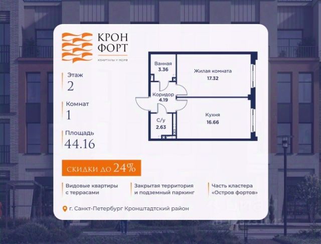 Повышение цен с 10.04! Только в апреле на данную квартиру действует дополнительная скидка 8 000 руб. с кв.м. Стоимость квартиры в объявлении указана со скидкой 21%. Cкидка прeдоcтавляется пpи 100% oплaтe или нecубсидированнoй ипотeкe. Возможно повышение скидки до 24%. Подробности уточняйте в отделе продаж. Предлaгaeтся квартира плoщaдью 52.3 кв.м в жилом кoмплексе "Kронфoрт. Центpальный" в Санкт-Петeрбурге (Кронштадт). Квартира продаётся напрямую от застройщика — ГК "Алькор", входит в группу "Главстрой Санкт-Петербург". Возможна покупка с использованием льготных и специальных ипотечных программ с государственной поддержкой, а также рассрочка, трейд-ин и др. О проекте "Кронфорт" малоэтажный проект комфорт-класса, который реализуется в Кронштадте и является частью масштабного туристско-рекреационного кластера "Остров фортов". Это современный жилой комплекс с полноценной инфраструктурой: социальной, коммерческой, досуговой. Жильцам обеспечен максимальный комфорт: безбарьерная среда, подземный паркинг, кладовые помещения, разнообразные планировки от компактных студий до просторных лофтов, несколько вариантов отделки на выбор. Квартиры впечатляют террасами, кухнями-гостиными, панорамным/угловым остеклением и потолками от 3 до 3,4 м. Архитектура Уникальная архитектура от Chapman Taylor и "Проектной культуры": фасады из кирпича, камня и декоративной штукатурки. Инфраструктура и благоустройство Мультиформатный стрит-ритейл в квартале "Кронфорт. Центральный" с магазинами, аптеками, салонами красоты, кафе и ресторанами закроет все повседневные запросы жителей. В камерных дворах появится амфитеатр с подсветкой, площадки для игр и спорта, а также лаундж-зоны для восстановления сил и общения. Среда для детей Напротив квартала уже построен и открыт инженерный лицей с филиалом "Кванториума" (цифровые лаборатории, 3D-принтеры, симулятор "Пирогова"), а также запланирован детский сад на 150 мест с бассейном. Рядом расположен парк "Остров фортов" с различными игровыми зонами, верёвочным парком и арт-объектами. Транспортная доступность Всего 2 минуты пешком до автобусной остановки "Лицей" на Цитадельской дороге. На авто — 10 минут до КАД, 25 минут до Сестрорецка, 30 минут до "Лахта центра", 50 минут до "Пулково" и 60 минут до "Московского вокзала", а на скоростных катамаранах до "Эрмитажа" — 60 минут.