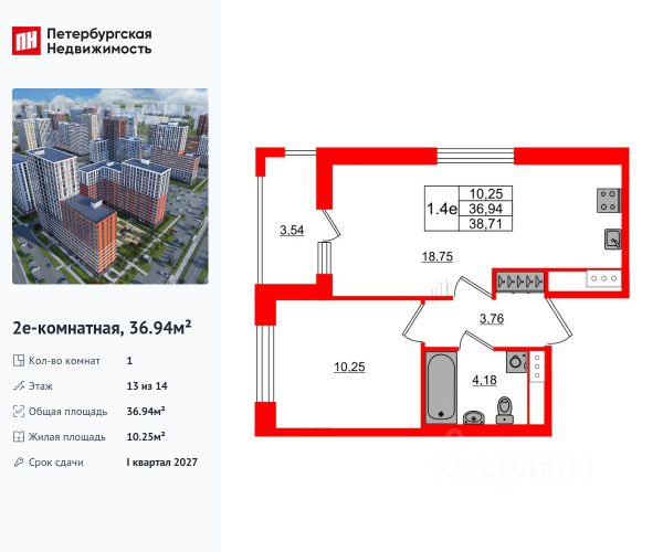 Комната 10.83 кв. м. , кухня 18.12 кв. м, прихожая 4.02 кв. м. , санузел 4,15 кв. м.,