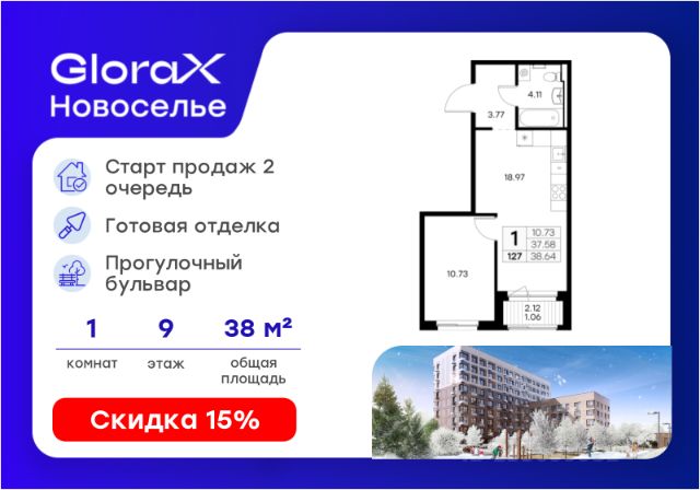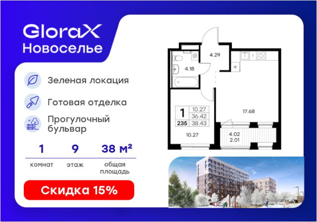 Продается 1-комн. квартира на 2-м этаже в строящемся проекте комфорт-класса GloraX Новоселье. Общая площадь лота составляет 38,64 кв. м, из которых 10,73 кв. м отведено под жилую и 18,97 кв. м под кухонную зону. Номер квартиры - 22 Преимущества квартиры: - Квартиры комфорт-класса - Зеленый район, 5 мин. до Гореловсого лесопарки, 10 мин. до Шунгеровского заказника - 7 мин. до КАД, 16 мин. до ЗСД - 864 м/м на открытой стоянке - Благоустроенный собственный прогулочный бульвар - Закрытые дворы с видеонаблюдением - Детские площадки с геопласткой и бизиборадми - Сад и школа в шаговой доступности - Спортивные площадки и вело-дорожки - Коммерческие помещения на 1 этажах GloraX Новоселье — новый проект комфорт-класса на юго-западной границе Санкт-Петербурга и Ленинградской области. Близость к зеленым зонам Гореловского лесопарка и природного Шунгеровского заказника, а также пешеходный многофункциональный бульвар в центре квартала — идеальное место для тех, кто ценит природу и тишину, при этом не готов отказываться от благ современной инфраструктуры. Застройка осуществляется в рамках единой концепции, предусматривающей не только создание комфортного жилья, но и формирование собственной внутренней благоустроенной среды. Территория каждого двора разделена на зоны отдыха, досуга и игровые площадки с учетом возраста и потребностей детей и взрослых создает неповторимую атмосферу, заряжающую энергией на новые свершения. Это проект, в котором спокойно во всех отношениях. Живите на природе, но с комфортом мегаполиса. Проведите теплые дни в Гореловском лесопарке. Познакомьте детей с историей в Стрельне, Петергофе или Красном селе. Они расположены в 30 минутах от проекта. До ж/д станции "Сергиево" 11 минут на автомобиле, до метро Проспект Ветеранов 20 минут, КАД 7 минут, ЗСД 16 минут. В шаговой доступности остановка общественного транспорта. Рядом с проектом будут построены школа и детский сад. Здесь все создано для максимального комфорта каждого жителя. Приватное пространство внутреннего двора с беседками для работы и отдыха, зеленый двор с уютным многоуровневым освещением, детскими эко-площадками и спортивными workout создает неповторимую атмосферу, заряжающую энергией на новые свершения. Цена указана при 100% оплате или стандартной ипотеке. Узнайте подробности в Отделе продаж. Купить квартиру евродвушку в новостройке рядом с метро Проспект Ветеранов.