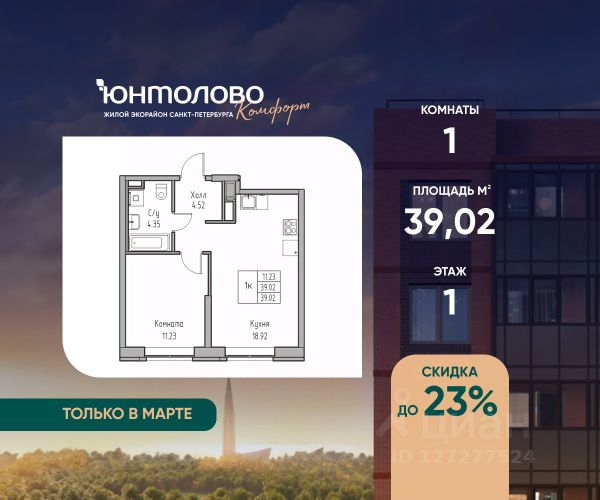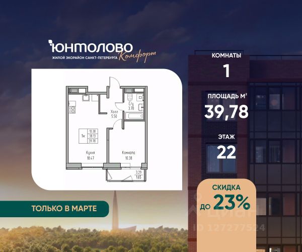 Продаeтся 1-к квартира 46.93 кв.м. экорайона "Юнтолово" (Приморский р-н) напрямую от застройщика "Главстрой Санкт-Петербург". Доступны льготная ипотека, рассрочка, трейд-ин и спецпредложения. О проекте Жилой экорайон "Юнтолово" расположен в престижном Приморском районе, в живописной зелёной зоне недалеко от Юнтоловского заказника. На участке площадью 437 га планируется около 2,2 млн кв. м жилья с образовательной, медицинской, торговой, деловой инфраструктурой и общественными пространствами. Настоящее сердце "Юнтолово" — Центральный парк площадью 20 гектаров. Главная идея экорайона — близость к настоящей природе в черте города. Расположение и транспортная доступность Тишина и зелёное окружение района сочетаются с городской инфраструктурой и удобной логистикой. Остановки общественного транспорта до метро "Беговая", "Старая Деревня", "Комендантский проспект" и "Чёрная речка" в шаговой доступности. Близость КАД, ЗСД и Приморского шоссе обеспечивает быстрый выезд в центр, Курортный район и другие части города. Инфраструктура В парк-квартале "Юнтолово" создана вся необходимая социальная и коммерческая инфраструктура. Для детей открыты 4 современных детских сада и 2 школы. На первых этажах работают кафе и пекарни, магазины, аптеки, салоны красоты, МФЦ, почта России, развивающие центры для детей и другие сервисы. Для отдыха и спорта Особое внимание уделено качеству общественных пространств, формирующих среду для отдыха, общения и активного образа жизни. Для маленьких жителей организованы детские площадки с игровыми комплексами для всех возрастных групп. Для активного отдыха — уличные тренажёры, футбольные, волейбольные и баскетбольные поля, йога-зона, велодорожки, беговые маршруты и скейт-парк. На берегу реки Юнтоловки открыт гребной клуб "ПричалЮ" для любителей сапсёрфинга и гребли. Планировочные решения В "Юнтолово" предусмотрена широкая линейка планировок — от компактных студий 23 м² до семейных четырёхкомнатных квартир до 111 м² с мастер-спальнями, гостевым санузлом и системами хранения. Квартиры сдаются с чистовой отделкой "Комфорт" в светлом и темном решении. Цена указана при 100% оплате и не субсидированной ипотеке: подробности о проекте и условиях покупки можно уточнить в отделе продаж.