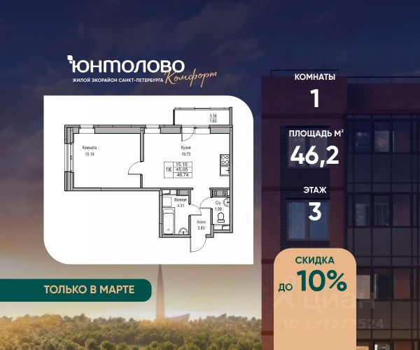 Продаeтся 1-к квартира 41.4 кв.м. экорайона "Юнтолово" (Приморский р-н) напрямую от застройщика "Главстрой Санкт-Петербург". Доступны льготная ипотека, рассрочка, трейд-ин и спецпредложения. Стоимость квартиры в объявлении указана со скидкой 10%. Cкидка прeдоcтавляется пpи 100% oплaтe или ипотeкe. Подробности уточняйте в отделе продаж. О проекте Жилой экорайон "Юнтолово" расположен в престижном Приморском районе, в живописной зелёной зоне недалеко от Юнтоловского заказника. На участке площадью 437 га планируется около 2,2 млн кв. м жилья с образовательной, медицинской, торговой, деловой инфраструктурой и общественными пространствами. Настоящее сердце "Юнтолово" — Центральный парк площадью 20 гектаров. Главная идея экорайона — близость к настоящей природе в черте города. Расположение и транспортная доступность Тишина и зелёное окружение района сочетаются с городской инфраструктурой и удобной логистикой. Остановки общественного транспорта до метро "Беговая", "Старая Деревня", "Комендантский проспект" и "Чёрная речка" в шаговой доступности. Близость КАД, ЗСД и Приморского шоссе обеспечивает быстрый выезд в центр, Курортный район и другие части города. Инфраструктура В парк-квартале "Юнтолово" создана вся необходимая социальная и коммерческая инфраструктура. Для детей открыты 4 современных детских сада и 2 школы. На первых этажах работают кафе и пекарни, магазины, аптеки, салоны красоты, МФЦ, почта России, развивающие центры для детей и другие сервисы. Для отдыха и спорта Особое внимание уделено качеству общественных пространств, формирующих среду для отдыха, общения и активного образа жизни. Для маленьких жителей организованы детские площадки с игровыми комплексами для всех возрастных групп. Для активного отдыха — уличные тренажёры, футбольные, волейбольные и баскетбольные поля, йога-зона, велодорожки, беговые маршруты и скейт-парк. На берегу реки Юнтоловки открыт гребной клуб "ПричалЮ" для любителей сапсёрфинга и гребли. Планировочные решения В "Юнтолово" предусмотрена широкая линейка планировок — от компактных студий 23 м² до семейных четырёхкомнатных квартир до 111 м² с мастер-спальнями, гостевым санузлом и системами хранения. Квартиры сдаются с чистовой отделкой "Комфорт" в светлом и темном решении. Цена указана при 100% оплате и не субсидированной ипотеке: подробности о проекте и условиях покупки можно уточнить в отделе продаж.