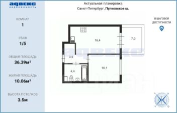 Сама квартира расположена на 5 этаже. Чистовая отделка — мрамор. Общая площадь Евро двухкомнатной квартиры 36.8 кв.м