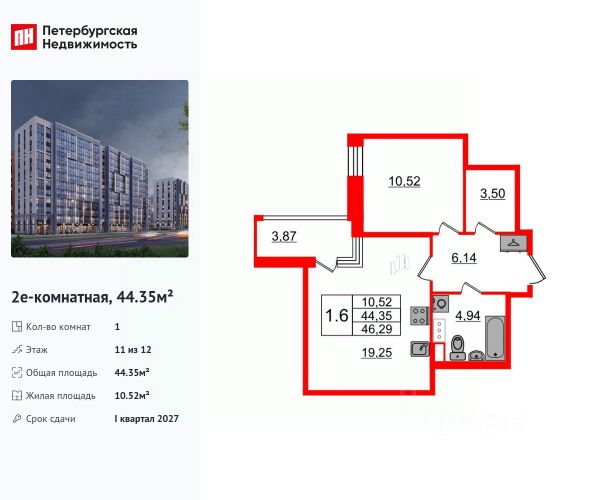 Продается просторная 1-комнатная квартира от застройщика в жилом комплексе "Бионика Заповедная" в динамичном Приморском районе. До метро можно добраться на транспорте всего за 11 минут. Удобная, классическая, функциональная европланировка, большая кухня-гостиная 19.25 м², просторная прихожая 6.14 м². Общая площадь квартиры - 44.35 м², жилая 10.52 м², высота потолка 2.77 м. Квартира продается с отделкой "NORD LINE WHITE ВК NEW". Что особенного в ЖК "Бионика Заповедная"? • Оазис в городе 3 минуты пешком до Новоорловского заказника (140 ГА) • Захватывающие виды из окон на хвойный лесопарк • Всесезонный "Заповедный парк" во дворе площадью 23000 кв.м. • 5 единых входных групп с авторским дизайном и лаундж-зонами, сити-виллы на первых этажах с палисадниками и высотой потолков до 4 м • Места притяжения: фонтан "Бионика", спортивный кластер со скейт-парком, фотозоны с арт-объектами