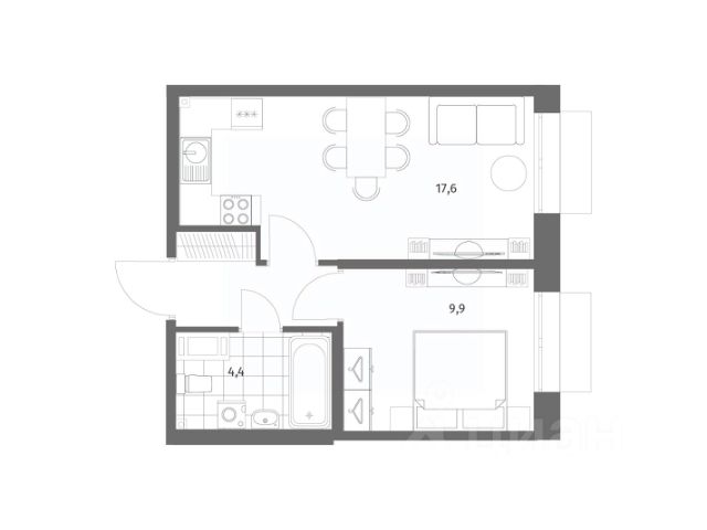 просторная кухня-гостиная 17,6 м² — сердце квартиры, где легко разместится обеденная зона, диван, медиа-зона;
