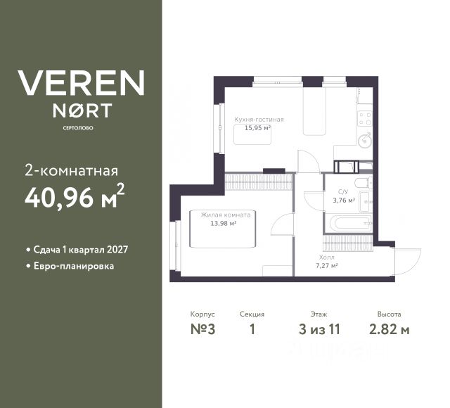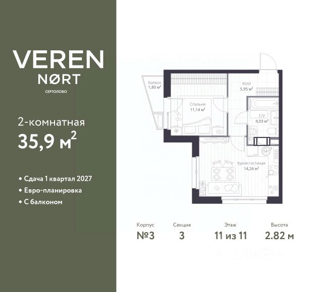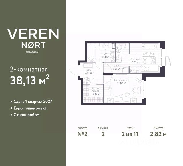 Спешите оформить бронирование по акционной цене! Предложение ограничено! Стоимость квартиры указана со скидкой, ваша экономия составит 1,060,521 RUB. Информация по телефону, наши менеджеры вам все расскажут! Однокомнатная квартира в Veren Nort Сертолово на 2 этаже. Квартира без отделки, после выдачи ключей можно делать ремонт. Общая площадь: 38.13 кв.м., жилая: 11.02 кв.м., площадь просторной куxни-гостиной: 14.01 кв.м. Все окна выходят на одну сторону. В квартире один совмещенный санузел. Высота потолков 2.82 м. Квартира находится в корпусе 2. Дом монолитный, одноподъездный, высотой 11 этажей. На этаже 14 квартир. В подъезде 1 пассажирский и 1 грузовой лифт. Начало строительства - 3 квартал 2023 года. Окончание строительства - 4 квартал 2025 года. Оформление сделки по договору долевого участия. Евро-планировка, с гардеробом, вид на приватный двор. Сочетание современной архитектуры и отличной экологии севера Лен. области. Выразительный облик домов разработан именитым архитектурным бюро "Остоженка". Характеристики жилого комплекса исключительны: продуманный ландшафтный дизайн, оригинальные парадные, разработанные по индивидуальному дизайн-проекту, современные детские и многофункциональные спортивные площадки, летний кинотеатр под открытым небом, два детских сада. Комплекс создается в уже сложившейся инфраструктуре г. Сертолово и обладает удобным транспортным сообщением с Санкт-Петербургом. В 300 метрах от "VEREN NORT сертолово" планируется транспортно-пересадочный узел "Сертолово", который обеспечит удобную железнодорожную связь с Финляндским вокзалом Санкт-Петербурга. #zSF7zA Купить 1-комнатную квартиру в ипотеку в Сертолово.