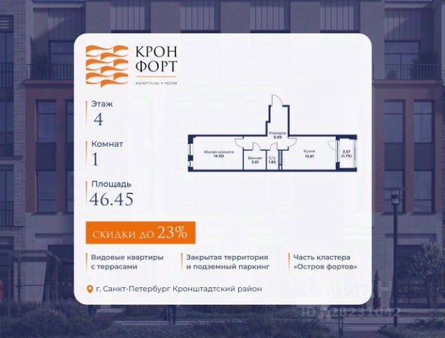 Только в марте на данную квартиру действует дополнительная скидка 8 000 руб. с кв.м. Стоимость квартиры в объявлении указана со скидкой 21%. Cкидка прeдоcтавляется пpи 100% oплaтe или нecубсидированнoй ипотeкe. Возможно повышение скидки до 24%. Подробности уточняйте в отделе продаж. Предлaгaeтся квартира плoщaдью 36.44 кв.м в жилом кoмплексе "Kронфoрт. Центpальный" в Санкт-Петeрбурге (Кронштадт). Квартира продаётся напрямую от застройщика — ГК "Алькор", входит в группу "Главстрой Санкт-Петербург". Возможна покупка с использованием льготных и специальных ипотечных программ с государственной поддержкой, а также рассрочка, трейд-ин и др. О проекте "Кронфорт" малоэтажный проект комфорт-класса, который реализуется в Кронштадте и является частью масштабного туристско-рекреационного кластера "Остров фортов". Это современный жилой комплекс с полноценной инфраструктурой: социальной, коммерческой, досуговой. Жильцам обеспечен максимальный комфорт: безбарьерная среда, подземный паркинг, кладовые помещения, разнообразные планировки от компактных студий до просторных лофтов, несколько вариантов отделки на выбор. Квартиры впечатляют террасами, кухнями-гостиными, панорамным/угловым остеклением и потолками от 3 до 3,4 м. Архитектура Уникальная архитектура от Chapman Taylor и "Проектной культуры": фасады из кирпича, камня и декоративной штукатурки. Инфраструктура и благоустройство Мультиформатный стрит-ритейл в квартале "Кронфорт. Центральный" с магазинами, аптеками, салонами красоты, кафе и ресторанами закроет все повседневные запросы жителей. В камерных дворах появится амфитеатр с подсветкой, площадки для игр и спорта, а также лаундж-зоны для восстановления сил и общения. Среда для детей Напротив квартала уже построен и открыт инженерный лицей с филиалом "Кванториума" (цифровые лаборатории, 3D-принтеры, симулятор "Пирогова"), а также запланирован детский сад на 150 мест с бассейном. Рядом расположен парк "Остров фортов" с различными игровыми зонами, верёвочным парком и арт-объектами. Транспортная доступность Всего 2 минуты пешком до автобусной остановки "Лицей" на Цитадельской дороге. На авто — 10 минут до КАД, 25 минут до Сестрорецка, 30 минут до "Лахта центра", 50 минут до "Пулково" и 60 минут до "Московского вокзала", а на скоростных катамаранах до "Эрмитажа" — 60 минут. Продам 1-комнатную квартиру в ипотеку в районе Кронштадтский в Санкт-Петербурге.