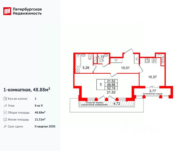 Продается просторная 1-комнатная квартира от застройщика в жилом комплексе "Кристалл Холл" в Адмиралтейском районе. До метро можно добраться Тип 1 всего за 15 минут. Удобная, классическая планировка, кухня 10.37 м², просторная прихожая 10.01 м². Общая площадь квартиры - 48.88 м², жилая 21.52 м², высота потолка 3 м. Квартира продается c черновой отделкой.