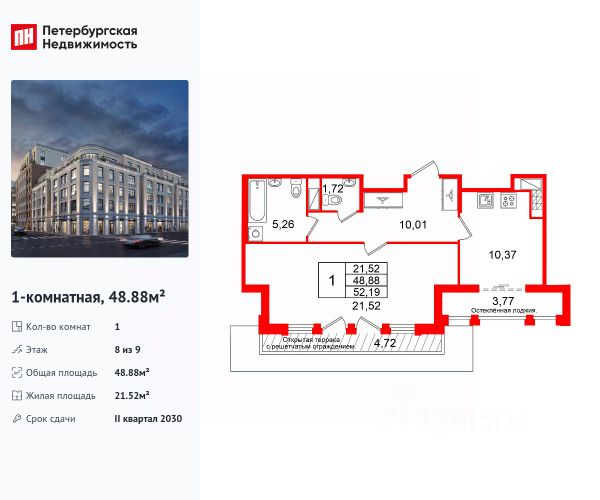 Продается просторная 1-комнатная квартира от застройщика в жилом комплексе "Кристалл Холл" в Адмиралтейском районе. До метро можно добраться пешком всего за 15 минут. Удобная, классическая планировка, кухня 10.37 м², просторная прихожая 10.01 м². Общая площадь квартиры - 48.88 м², жилая 21.52 м², высота потолка 3 м. Квартира продается c черновой отделкой. Что особенного в ЖК "Кристалл Холл"? • 300 м. до наб. Фонтанки, в двух шагах от Троицкого собора и Юсуповского дворца. • Сочетание стилей модерн и эклектика, дополненных элементами классического петербургского стиля. • Клубный дом премиум-класса - всего 236 квартир. • Парадное лобби с потолком до 6,5 м и лаунж-зоной с камином. • Камерный сад, зеленая гостиная, фонтан. • Клуб резидентов: кинотеатр, бильярдная комната, переговорная, детский клуб, фитнес-зал с комнатой для йоги. • Потолки от 3 м до 3,45 м. • Премиальная отделка квартир - Норд Лайн бизнес