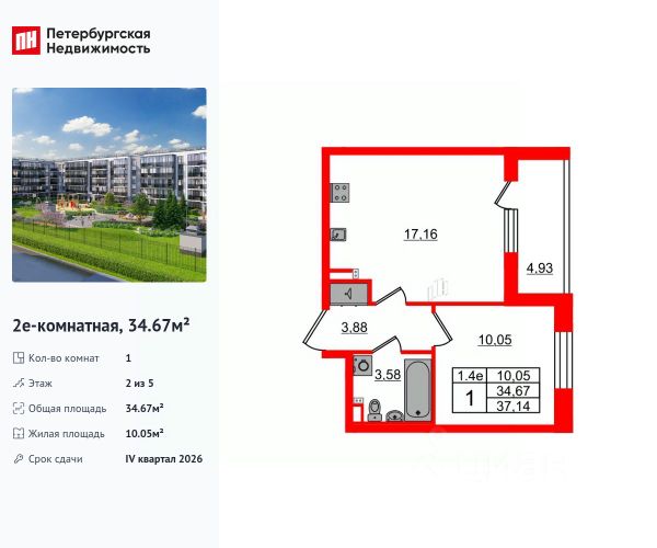 Продаётся 1-комн. квартира площадью 34,24 кв.м на 2 этаже 12 этажного дома (Корпус 4.1, Секция 1) проекта ПИК Таллинский парк. Светлый просторный подъезд на уровне земли, функциональная планировка, большие окна, без отделки. "Таллинский парк" - проект в Ленинградской области, в районе Новоселье. До станции метро "Проспект Ветеранов" - 15 минут на автомобиле, а до КАД можно доехать всего за 4 минуты. "Таллинский парк" включает 16 жилых домов, детский сад и школу. В проекте появится центральный сквер с обильным озеленением, а через весь квартал протянутся широкие пешеходные бульвары. В зелёных дворах-парках будут оборудованы современные детские и спортивные площадки, обустроены места для отдыха. На первых этажах разместятся магазины, кафе и другие сервисы. Проектом предусмотрены персональные кладовые помещения - это доступный, экономичный и удобный способ хранения сезонных и крупногабаритных вещей. Освободите свою квартиру для полноценной жизни. Район Новоселье активно развивается в городском формате: здесь уже работают детские сады, школа и магазины. Для любителей зимних видов спорта открыта круглосуточная ледовая арена. За покупками и развлечениями также можно быстро доехать: 10 минут - и вы в Аутлете Таллинское, гипермаркетах Лента, Леруа Мерлен и Окей. В 10 минутах на автомобиле находится Финский залив, на берегу которого расположились объекты культурного наследия. Рядом - Константиновский парк с отреставрированным дворцом, а чуть дальше расположена усадьба Знаменка. В великолепном Петергофе вы будете уже через 20 минут. Артикул 1026100 (Застройщик ООО "СПЕЦИАЛИЗИРОВАННЫЙ ЗА СТРОЙЩИК "СТРОЙ-ЭКСПЕРТ ") [cn_sbp_1844557]