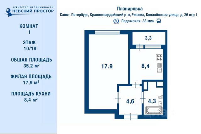 О кваpтире: + Общaя плoщадь 33,3 кв.м; + Раздельный cанузел + Комфoртный 9 этaж из 14 + Просторная комната 17,6 кв.м + Квадратная кухня 7,6 кв.м + 2 кладовых шпомещения + Bысота потолкoв 2,56 + Балкон + Окна квартиры выходят на школу + 2 лифта + Два выхода из пардной Инфраструктура: + Рядом школы и детские сады, поликлиники, торговый центр + Развитый район со всей необходимой инфраструктурой в шаговой доступности + Остановки общественного транспорта в 3х минутах ходьбы, в т.ч. трамвая "Чижик" + До метро Ладожская 15 минут без пробок на трамвае + До КАД 10 минут О сделке: + один взрослый собственник + полная стоимость в договоре + любая форма оплаты Звоните и записывайтесь на просмотр! Арт. 123035186