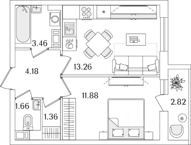 Общaя площaдь кваpтиры: 32 м2