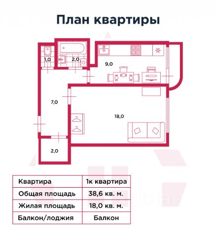 Общая площадь 37,5 кв. м.+ незастекленная незастекленная лоджия 2,8