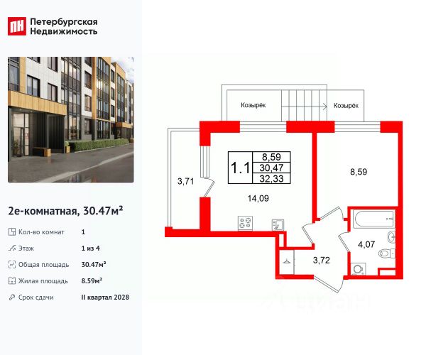 Продается уютная 1-комнатная квартира от застройщика в жилом комплексе "Univer City" в на юге Санкт-Петербурга. До метро можно добраться на транспорте всего за 30 минут. Удобная, классическая, функциональная европланировка, большая кухня-гостиная 14.09 м², вместительная прихожая 3.72 м². Общая площадь квартиры - 30.47 м², жилая 8.59 м², высота потолка 2.77 м. Квартира продается с отделкой "NORD LINE WHITE". Что особенного в ЖК "Univer City"? • Малоэтажное строительство • Скандинавские фасады с отделкой керамогранитом, акцентные входные группы • Закрытые внутренние дворы без машин • Пешеходный променад с тематическими зонами, еловый сквер и яблоневый сад • Univer Park, включая SetlSport и SetlKids, площадку для выгула собак и зоны отдыха • Инновационный Лицей Setl с оригинальной архитектурной концепцией и уникальной образовательной средой