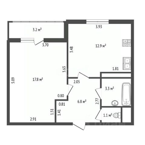 общая площадь 35,21 кв.м., большая кухня 11,21 кв.м., спальня 15,34 кв.м., прихожая 4,86 кв.м., с/у раздельный, потолки 2,7 м.