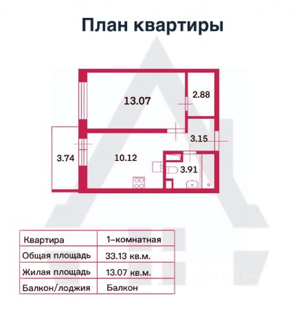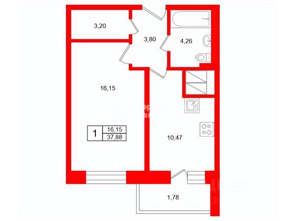 Общая площадь квартиры 34.7 кв.м. + балкон - 4.1 кв.м, комната 16.9 кв.м, кухня 10.4 кв.м, прихожая 3.4 кв.м, площадь санузла 4 кв.м.