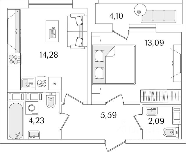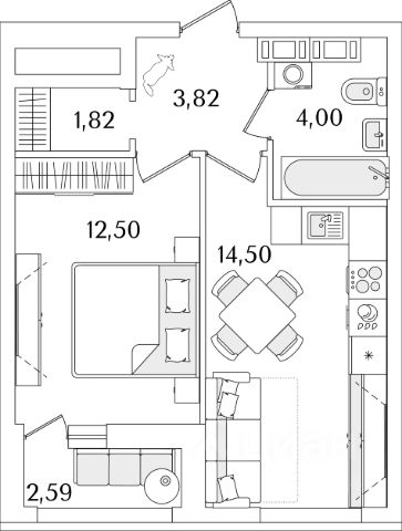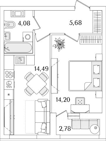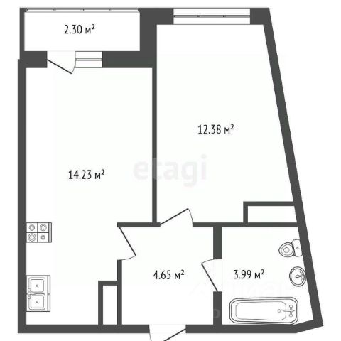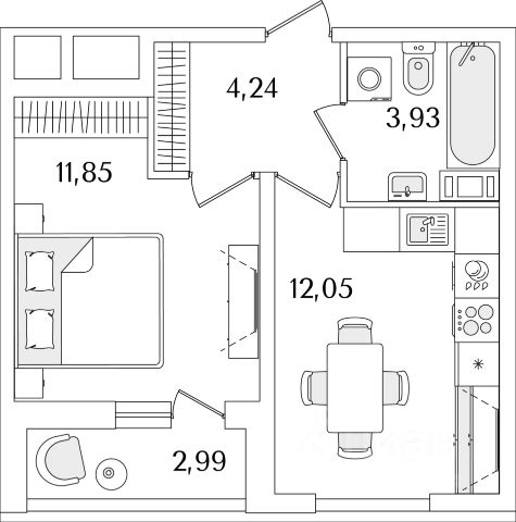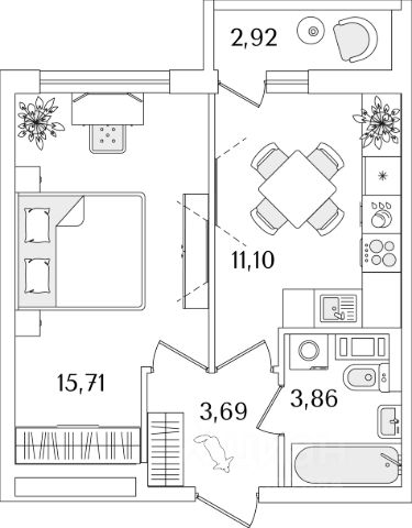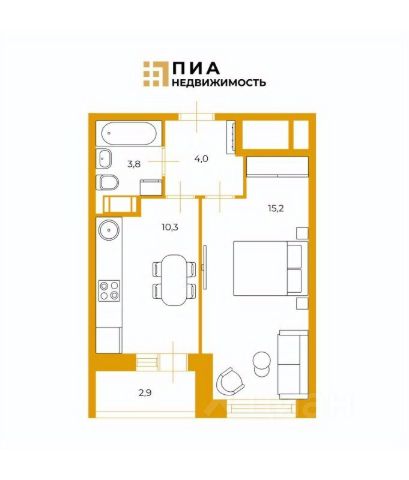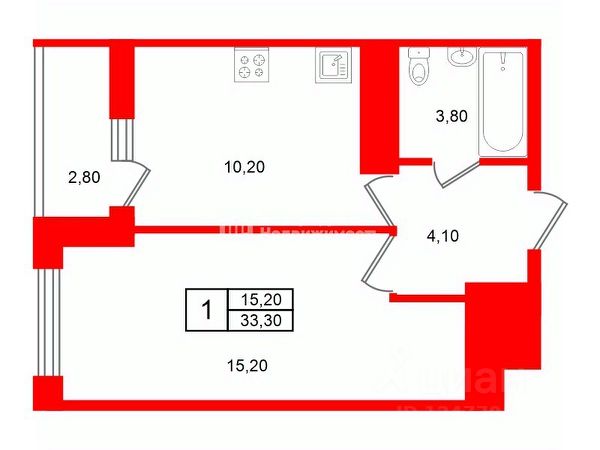 Комната площадью 15,2 кв.м, кухня 10,2 кв.м., совмещенный санузел, лоджия 3,9 кв.м. (выход на лоджию из кухни), потолки 2,7 м.