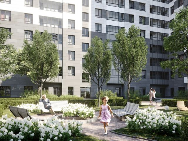 Большой закрытый двор с детской площадкой, местами для отдыха и прогулочными дорожками.