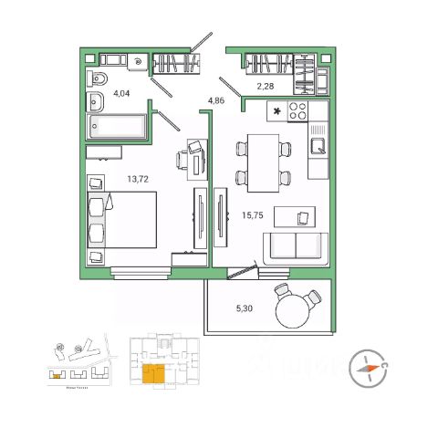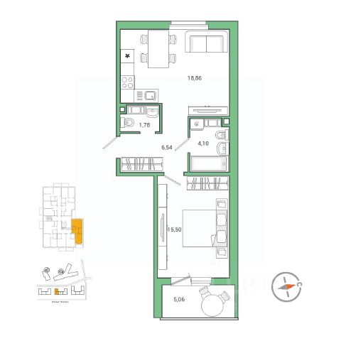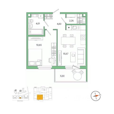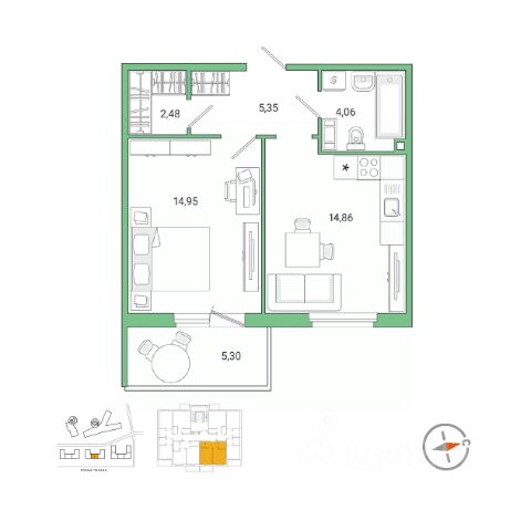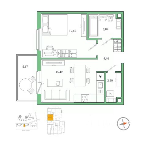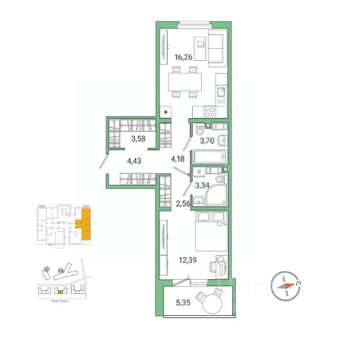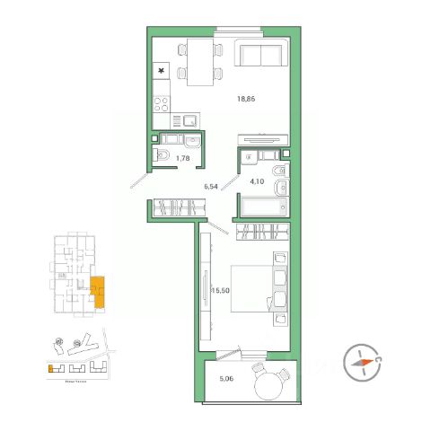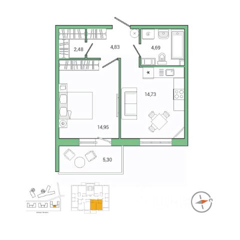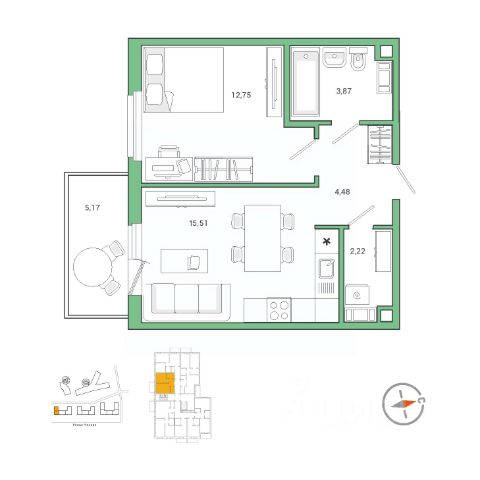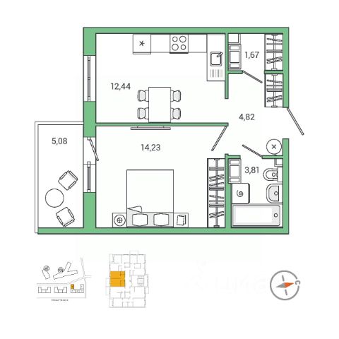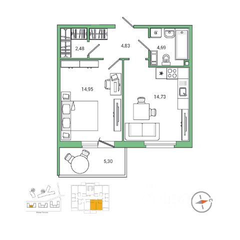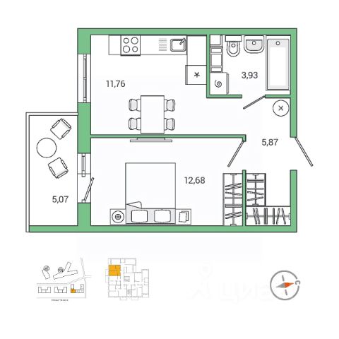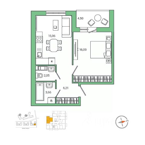 Планировка удобная и продуманная: жилая комната 16,8 м² с выходом на лоджию, кухня правильной формы площадью 7,5 м²