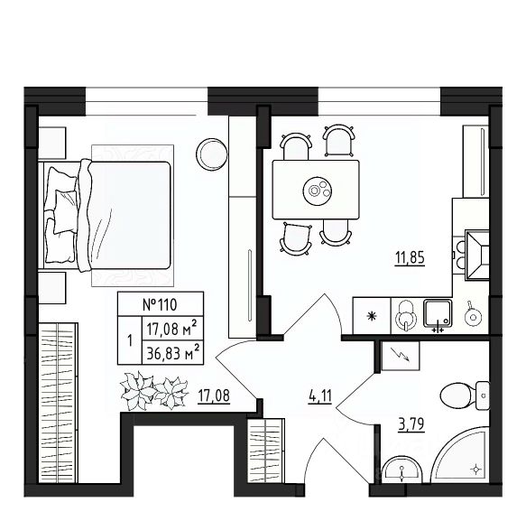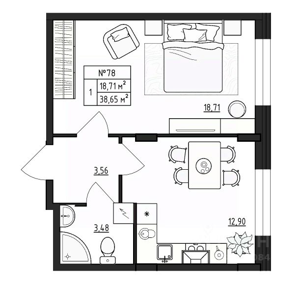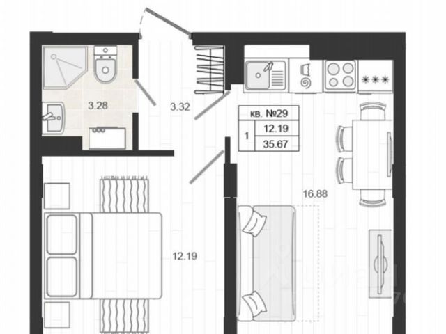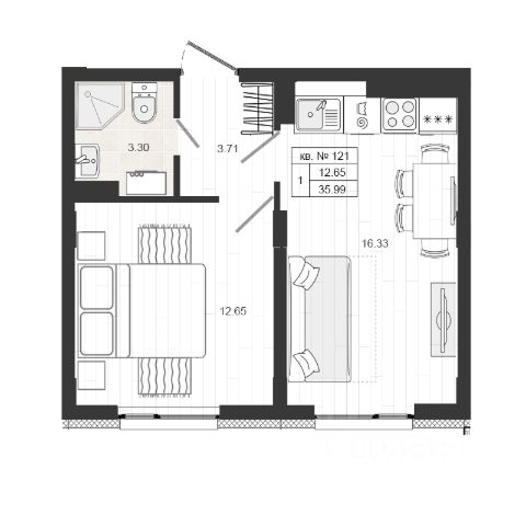 Планировка: кухня-гостиная 16,19 м² и спальня 12,30 м²