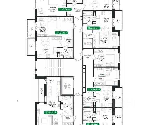 Более 60 вариантов планировок площадью от 22 до 79 м² — от студий до семейных квартир. Доступны форматы с кухнями-гостиными, мастер-спальнями, гардеробными и двумя санузлами. Отдельный формат — квартиры с террасами до 70 м² на верхних этажах.
