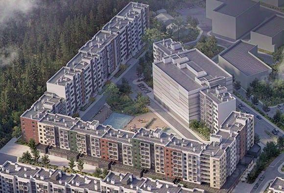 Современная среднеэтажная застройка с увеличенными расстояниями между корпусами создаёт ощущение простора и уединённости. Фасады выполнены в лёгкой скандинавской стилистике, увеличенные окна и остеклённые лоджии наполняют квартиры светом и открывают виды на природу.
