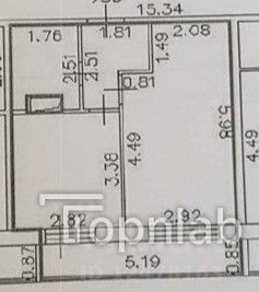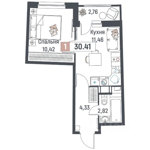 Кухня 9,5 кв.м., спальня 19 кв.м., санузл 4 кв.м, лоджия 2,5 кв.м.