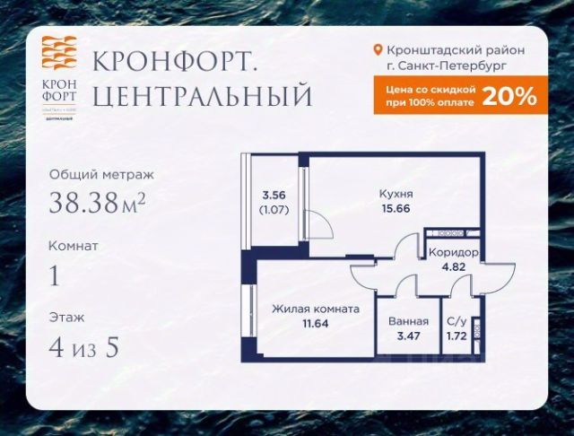 Стоимость квартиры указана со скидкой 20%. Скидка предоставляется при 100% оплате или несубсидированной ипотеке. Предлагается квартира площадью 40.69 кв.м в жилом комплексе "Кронфорт. Центральный" в Санкт-Петербурге (Кронштадт). Возможна покупка с использованием льготных и специальных ипотечных программ с государственной поддержкой. Высота потолков в квартирах — от 3 до 3,4 метров, окна увеличенного размера, есть варианты с эркерами, французскими балконами, лоджиями и террасами. Жилой квартал состоит из пяти четырехэтажных корпусов с закрытыми охраняемыми дворами, свободными от машин. Первые этажи формируют торговые променады в стиле пешеходных улиц исторической части Петербурга и Кронштадта. Внутренние пространства между корпусами — пешеходные зоны с уютными площадями. Архитектурный облик квартала разработан бюро "Проектная культура" и международной компанией Chapman Taylor. Инфраструктура комплекса включает: - Лицей с двумя бассейнами - Детский сад на 150 мест с бассейном и закрытой территорией - Веревочный парк - Игровые площадки для активного отдыха; - Кабинет врача общей практики. - Подземные паркинги с лифтами. - Мусоросборные камеры, индивидуальные кладовые. - Закрытые дворы с контролем доступа и видеонаблюдением. - Мультформатный стрит-ретейл с кафе и ресторанами. - Триатлон-центр и беговые/велодорожки. - Учебно-тренировочный комплекс для детей "Лагерь настоящих героев". Транспортная доступность обеспечивает удобный выезд на КАД (около 1-3 км), 2 минуты пешком до автобусной остановки "Лицей", 25 минут до Сестрорецка, 30 минут до "Лахта-центра", 50 минут до аэропорта "Пулково" и 60 минут до Московского вокзала. Для любителей моря доступен маршрут на "Метеоре" до центра Санкт-Петербурга. Отделка квартир предлагается как с готовой чистовой отделкой, так и со свободной планировкой без отделки для реализации индивидуальных дизайнерских решений. В третьем корпусе, продажи которого стартовали в марте 2025 года, доступны квартиры с просторными террасами, тремя балконами, кухнями-гостиными до 38 кв.м с окнами на две стороны, обеспечивающими панорамное освещение и виды. Если вам нужна помощь с оформлением ипотеки или дополнительная информация по комплексу и условиям покупки, обращайтесь в отдел продаж за консультацией.