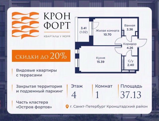 Стоимость квартиры указана со скидкой 20%. Скидка предоставляется при 100% оплате или несубсидированной ипотеке. Предлагается квартира площадью 46.45 кв.м в жилом комплексе "Кронфорт. Центральный" в Санкт-Петербурге (Кронштадт). Возможна покупка с использованием льготных и специальных ипотечных программ с государственной поддержкой. Высота потолков в квартирах — от 3 до 3,4 метров, окна увеличенного размера, есть варианты с эркерами, французскими балконами, лоджиями и террасами. Жилой квартал состоит из пяти четырехэтажных корпусов с закрытыми охраняемыми дворами, свободными от машин. Первые этажи формируют торговые променады в стиле пешеходных улиц исторической части Петербурга и Кронштадта. Внутренние пространства между корпусами — пешеходные зоны с уютными площадями. Архитектурный облик квартала разработан бюро "Проектная культура" и международной компанией Chapman Taylor. Инфраструктура комплекса включает: - Лицей с двумя бассейнами - Детский сад на 150 мест с бассейном и закрытой территорией - Веревочный парк - Игровые площадки для активного отдыха; - Кабинет врача общей практики. - Подземные паркинги с лифтами. - Мусоросборные камеры, индивидуальные кладовые. - Закрытые дворы с контролем доступа и видеонаблюдением. - Мультформатный стрит-ретейл с кафе и ресторанами. - Триатлон-центр и беговые/велодорожки. - Учебно-тренировочный комплекс для детей "Лагерь настоящих героев". Транспортная доступность обеспечивает удобный выезд на КАД (около 1-3 км), 2 минуты пешком до автобусной остановки "Лицей", 25 минут до Сестрорецка, 30 минут до "Лахта-центра", 50 минут до аэропорта "Пулково" и 60 минут до Московского вокзала. Для любителей моря доступен маршрут на "Метеоре" до центра Санкт-Петербурга. Отделка квартир предлагается как с готовой чистовой отделкой, так и со свободной планировкой без отделки для реализации индивидуальных дизайнерских решений. В третьем корпусе, продажи которого стартовали в марте 2025 года, доступны квартиры с просторными террасами, тремя балконами, кухнями-гостиными до 38 кв.м с окнами на две стороны, обеспечивающими панорамное освещение и виды. Если вам нужна помощь с оформлением ипотеки или дополнительная информация по комплексу и условиям покупки, обращайтесь в отдел продаж за консультацией.