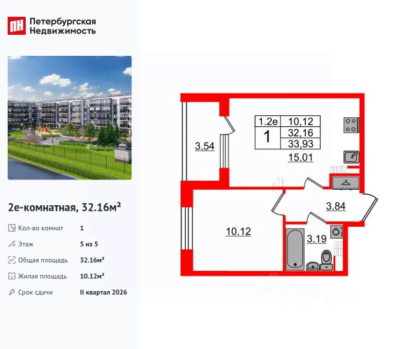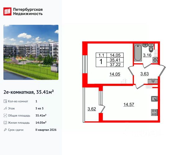 Евродвухкомнатная квартира с собственной террасой на последнем этаже малоэтажного дома в ЖК "Зелёный квартал на Пулковских высотах".
