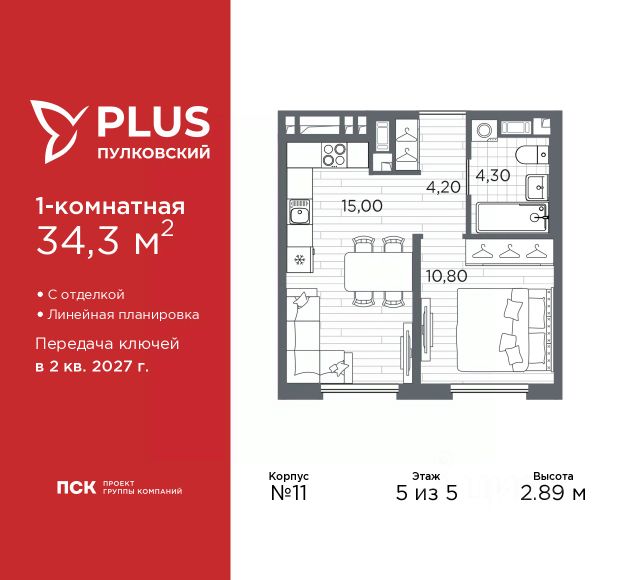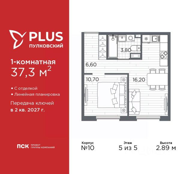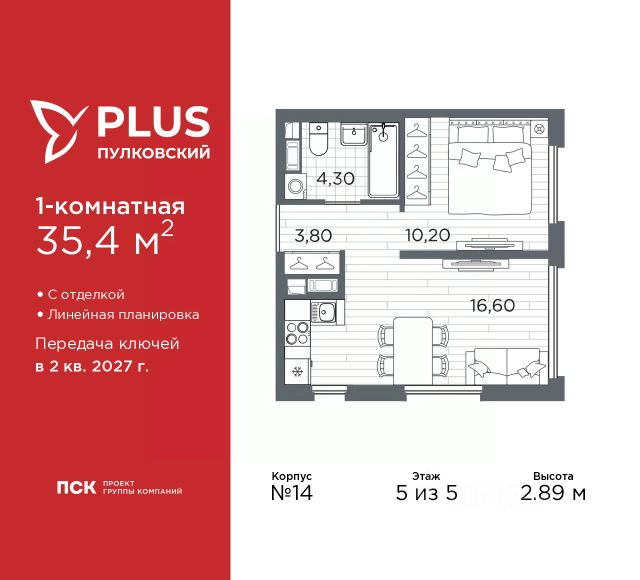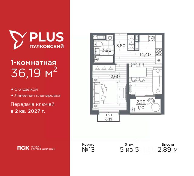 Продается однокомнатная квартира от застройщика с отделкой в ЖК "PLUS Пулковский" на 5 этаже. Общая площадь: 38.38 кв.м., жилая: 11.1 кв.м., площадь просторной кухни-столовой: 17.7 кв.м. Квартира угловая, очень светлая, естественная вентиляция при открытии окон. В квартире один балкон и одна лоджия, один совмещенный санузел. Высота потолков 2.89 м. Дом монолитный, трехподъездный, высотой 5 этажей. Квартира находится в 3-й секции в корпусе 13. На этаже 6 квартир. В подъезде 1 грузовой лифт. Начало строительства - 1 квартал 2026 года. Окончание строительства - 2 квартал 2027 года. Оформление сделки по договору долевого участия. ЖК "PLUS Пулковский" расположен в престижном Московском районе на пересечении Пулковского и Волхонского шоссе, по которым можно быстро добраться до КАД и до станций метро Московская и Звёздная. Поблизости расположены дворцово-парковые ансамбли Пушкина, Павловска, Петергофа, Гатчины, Ломоносова, а также вся торговая и развлекательная инфраструктура: ТК Лето, Outlet Village Pulkovo, Пулково-3, гипермаркеты Лента, Окей, Metro. На территории комплекса будут построены средняя образовательная школа на 825 мест с двумя бассейнами, 2 детских сада на 220 мест каждый. В детских садах тоже будут бассейны. Кроме этого будет построен медицинский центр для взрослых и детей. Во дворах буду оборудованы спортивные и безопасные детские площадки, на первых этажах домов будут расположены коммерческие помещения. Для автолюбителей будут подземные и наземный паркинги. Для жителей домов будет доступно "приложение жителя", которое предоставит такие возможности: — дистанционное открытие дверей в парадную и на территорию комплекса, — просмотр изображений с видеокамер, — контроль за показаниями счетчиков, — коммуникация с УК. Показания всех счетчиков будут собираться дистанционно. В квартирах будет выполнена коллекторная разводка отопления в стяжке пола от коллекторов в межквартирных коридорах. Застройщик ЖК "PLUS Пулковский" - группа компаний ПСК, которая является одной из ведущих девелоперских компаний Санкт Петербурга. Более 16 лет она возводит в Северной столице качественное жилье премиум, бизнес и комфорт-класса, социальные объекты школы и детские сады, апарт-комплексы и торговые центры и является четырехкратным обладателем золотого знака "Надежный застройщик России". #zmf337