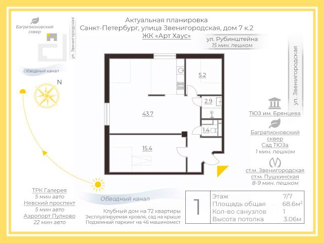Арт. 126151339 "Артхаус" - это клубный дом бизнес-класса всего на 72 квартиры в самом центре светского Петербурга, открытый для ярких событий, но удалённый от суеты парадных кварталов и шумных магистралей. Сегодня это район, где сосредоточены знаковые места светской жизни Петербурга театры, художественные галереи, одни из лучших баров и ресторанов города. Придомовая территория примыкает к строящейся Новой сцене Малого драматического театра (МДТ Театр Европы Льва Додина). В радиусе полутора километров от "Артхауса" еще 15 театров, среди которых МДТ (Старая сцена), БДТ, Александринский, Театр им. Ленсовета, Филармония джазовой музыки, ТЮЗ. Из окон "Артхауса" открывается вид не только на романтические городские крыши, но и на зелень парков это редкое для центра Петербурга преимущество локации. Дом расположен прямо у Багратионовского сквера и в 200 метрах от сада Театра юных зрителей. Квартира полностью готова для проживания, сделан абсолютно новый ремонт. Функционал - большая кухня-гостиная 44 м2, спальная комната, раздельный санузел, прачечная с кладовой, просторный холл с гардеробной. Также с продажей квартиры предлагаем одно машиноместо в подземном паркинге за отдельнуюстоимость. Звоните и записывайтесь на просмотр!
