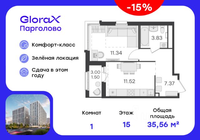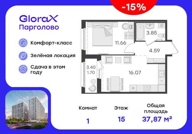 Продается 1-комн. квартира на 15-м этаже в проекте комфорт-класса GloraX Парголово. Общая площадь лота составляет 35,22 кв. м, из которых 11,26 кв. м отведено под жилую и 14,44 кв. м под кухонную зону. Номер квартиры - 625. Преимущества: - Квартира комфорт-класса с полной чистовой отделкой - Зеленый район, Шуваловский парк в 20 мин. пешком - 10 мин. до КАД, 15 мин. до ЗСД - 5 эт. паркинг на 451 м/м - Закрытые дворы с видеонаблюдением - Детские площадки с геопласткой и бизиборадми - Сады и школы в шаговой доступности - Спортивные площадки и велодорожки - Собственный комьюнити-центр - Келлеры для хранения - Коммерческие помещения на 1 этажах GloraX Парголово — масштабный проект комфорт-класса в Выборгском районе Санкт-Петербурга. Место, продуманное до мелочей, где все, что необходимо — рядом. Архитектурно-пространственное решение отличается лаконичностью и строгостью и придает проекту свой характер. Внутренние дворы закрыты от внешнего мира, создавая приватную территорию для жителей. Живите на природе, но с комфортом мегаполиса. Десять минут на велосипеде или полчаса пешком — и вы окажетесь в одном из культовых мест отдыха петербуржцев: Шуваловском парке, Орловском заказнике с их чистыми карьерами или на Суздальских озерах. До ж/д станции "Парголово" 7 минут на автомобиле, до метро Проспект Просвещения 25 минут, КАД 10 минут, ЗСД 15 минут. В шаговой доступности остановка общественного транспорта. В шаговой доступности — собственные школы и детские сады. Здесь все создано для максимального комфорта каждого жителя. Приватное пространство внутреннего двора с беседками с розетками для работы и отдыха, зеленый двор с уютным многоуровневым освещением, детскими эко-площадками и спортивными workout создает неповторимую атмосферу, заряжающую энергией на новые свершения. Квартиры сдаются с предчистовой отделкой White box, с возможностью дозаказа отделки в двух цветовых вариантах. Цена указана при 100% оплате или стандартной ипотеке. Узнайте подробности в Отделе продаж.