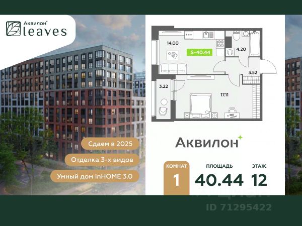 Купи квартиру в ЖК "Аквилон Leaves"! Отделка В квартире выполнена предчистовая отделка WhiteBox +Возможен дозаказ отделки в любом из 3 цветов: SAND, TERRA, GRAPHITE Отделка входит в стоимость квартиры в ДДУ ЖК "Аквилон Leaves" Жилой комплекс класса бизнес-лайт "Аквилон Leaves" воплощает идеальную синергию природы, технологий и дизайна. В одном из самых престижных районов Санкт-Петербурга мы создаем функциональную жилую среду, которая позволит максимально быстро и удобно решать бытовые вопросы, сохраняя ценное время для семьи и любимых занятий. -Малошумные лифты -Сквозные парадные -Светопрозрачные входные группы -Увеличенная высота первого этажа -Безбарьерная среда -Подземный паркинг Стандарты Группы Аквилон для вашей комфортной жизни Thermo-S экономия на коммунальных платежах за счет дополнительно утепленных стен, кровли и цоколя. Энергоэффективные окна с селективным покрытием и аргоновым заполнением Soundstop - дополнительная шумоизоляция внутренних перегородок и межэтажных перекрытий, шумозащитные окна, малошумные лифты Light-in - в квартирах устанавливаются широкоформатные окна, увеличены на 30%. Высота подоконников на уровне 60 см от пола. Vent-in - в каждой комнате есть клапаны индивидуальной вентиляции, которые обеспечивают приток свежего воздуха с улицы. inHOME умный дом в каждой квартире Интеллектуальная цифровая система, которая позволит дистанционно решать бытовые вопросы, управлять квартирой и экономить на оплате коммунальных услуг. В состав inHOME входят: IP-домофон, Face key, "умные" счетчики, датчики протечки, дистанционное отключение розеток, и т.д. Двор ваш личный парк Благоустройство двора от студии ландшафтного дизайна MEGABUDKA отсылает нас к образу зеленого листа. Современная архитектура гармонирует с окружающей средой, а экологические стандарты и "умные" системы обеспечивают ежедневный комфорт. -Зонирование на площадки для активного и спокойного отдыха. -Ландшафт с геопластикой и рельефом напоминает естественную красоту природных парков. -Всесезонные растения -Высаживаются взрослые деревья и кустарники Локация и инфраструктура Помимо разнообразной инфраструктуры, рядом с комплексом расположен Пулковский парк и сад "Дубовая роща". У жителей будут все возможности для отдыха на свежем воздухе. Велопрогулка, пробежка или летний пикник наслаждайтесь природой, не уезжая далеко загород. -10 мин. до м. Московская -15 мин. до м. Звездная -15 мин. до аэропорта Пулково -30 мин. до Невского пр. #zz4418