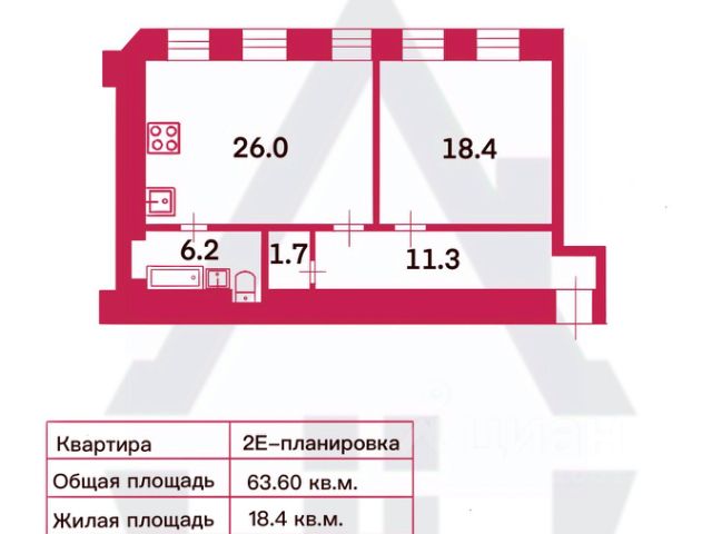 Двухкомнатная квартира общей площадью 67,8 кв.м. + кладовка 2,85 кв.м. также с очень высокими потолками, площадь кухни: 15 метров, сан/узел совмещённый,
