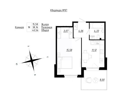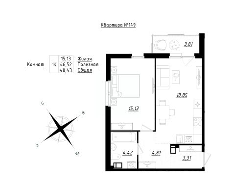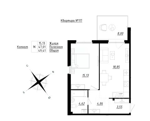 Просторную кухню площадью 15,02 м', дополненную лоджией в 3,49 мг