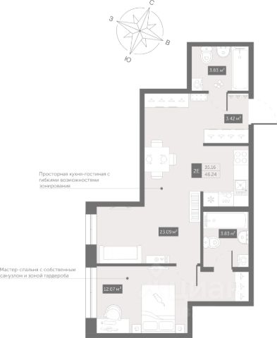 О КВАРТИРЕ: - очень функциональная планировка, все помещения правильной формы, прихожая с гардеробной 4 кв. м., широкие окна, в спальне панорамное окно, французский балкон, лоджия из кухни 3.38 кв. м., квартира расположена на высоком 5 этаже 12 эт. дома, сан. узел с ванной совмещенные, очень светлая и тихая квартира, не угловая, находится далеко от лифтов.
