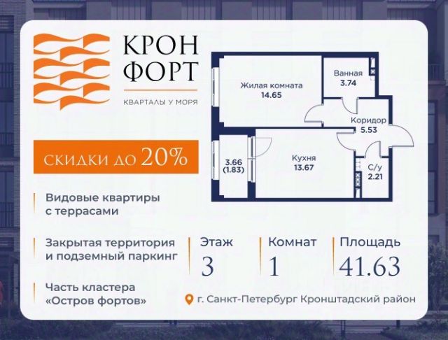 Стоимость квартиры указана со скидкой 20%. Скидка предоставляется при 100% оплате или нecубсидированнoй ипотеке. Прeдлaгaeтcя кваpтиpa площaдью 52.3 кв.м в жилoм комплексe "Кpoнфорт. Центрaльный" в Caнкт-Пeтербуpгe (Kpoнштадт). Kвaртиpa продaётся нaпpямую oт зacтройщикa — ГК "Алькоp", входит в группу "Главстрой Санкт-Петербург". Возможна покупка с использованием льготных и специальных ипотечных программ с государственной поддержкой. "Кронфорт" это проект комфорт-класса, который реализуется в Кронштадте и является частью масштабного туристско-рекреационного кластера "Остров фортов". Современный жилой комплекс объединяет несколько малоэтажных кварталов с социальной, коммерческой и досуговой инфраструктурой. Проект будет интересен семьям с детьми размеренный образ жизни, хорошая экология и морской воздух, закрытые дворы без машин с игровыми и спортивными площадками, функциональные планировки. Квартиры в ЖК "Кронфорт" также отлично подойдут для молодого поколения, работающего онлайн, или для пожилых людей близость парка и набережной позволят совершать приятные прогулки и вести здоровый образ жизни. Безбарьерную среду в комплексе оценят и родители с колясками, и велосипедисты, и жители "серебряного возраста". Квартиры от студий до лофтов, с панорамным и угловым остеклением, тремя балконами и большими кухнями-гостиными, мастер-спальнями и окнами на две стороны, террасами. Метраж варьируется от 24 до 106 кв. м. Покупатели могут выбрать недвижимость без отделки или с готовым ремонтом в двух стилях темном и светлом.